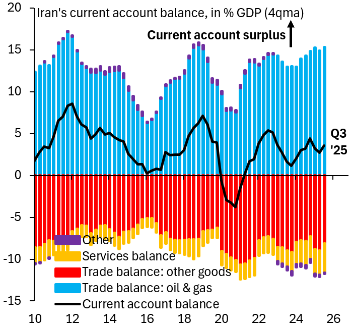 Brooks posted that Iran’s large current account surplus —- driven overwhelmingly by oil and gas exports -- would be wiped out under a full maritime blockade. In a chart highlighting Iran’s balance of payments, the bulk of inflows comes from energy exports, which he argued would fall to zero if shipping is halted.