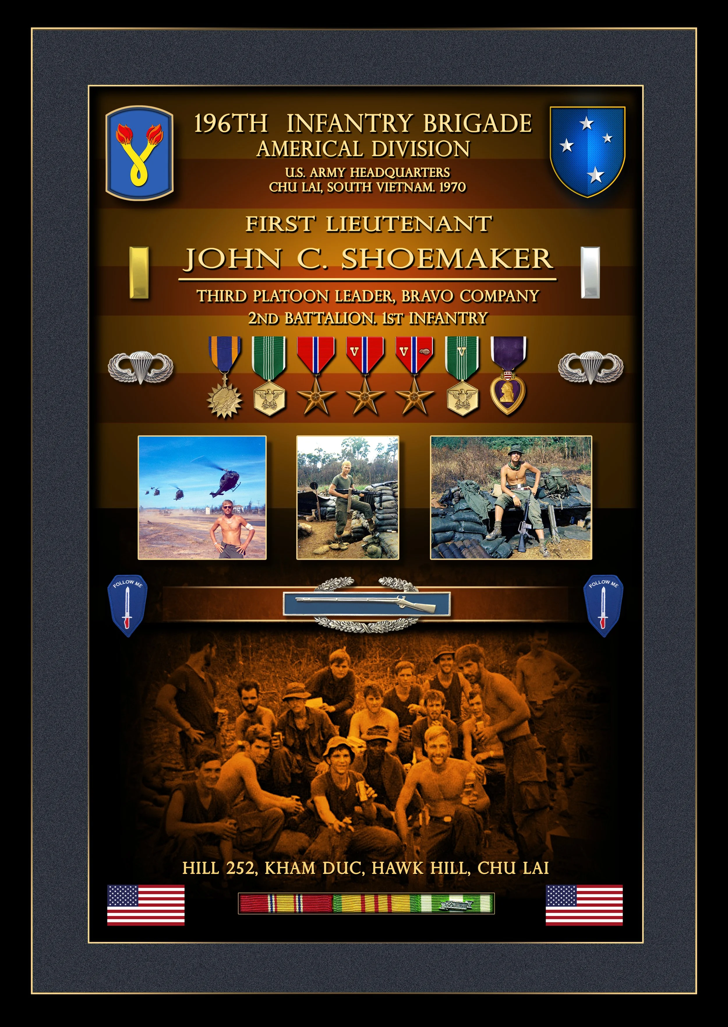 John Shoemaker was a First Lieutenant and both an infantry platoon leader and company commander for the 3rd Platoon, Bravo Company, and HHQ CO for the 2nd Battalion, 1st Infantry, 196th Light Infantry Brigade, of the Americal Division. He was 23 years old. At this writing, 54 years later in March of 2024, he is retired and living in Florida with his wife, Paula, whom he married on December 21, 1968.